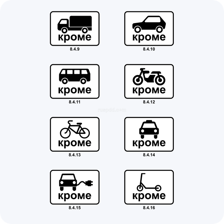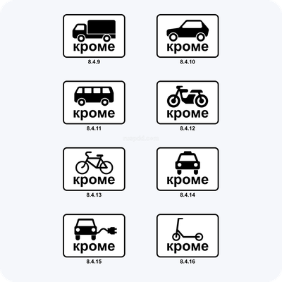 Дорожные знаки 8.4.9., 8.4.10., 8.4.11., 8.4.12., 8.4.13., 8.4.14., 8.4.15., 8.4.16 Кроме вида транспортных средства