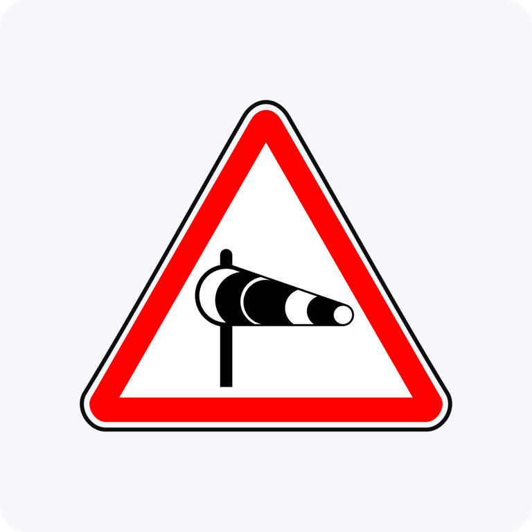 Предупреждает о сильных боковых ветрах. Необходимо снизить скорость и держаться как можно ближе к центру занимаемой полосы, чтобы в случае порыва не оказаться на обочине или на встречной полосе.