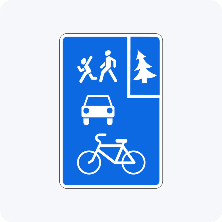 Описание знака: Люди, машина, ёлка и велосипед на голубом фоне, прямоугольник.