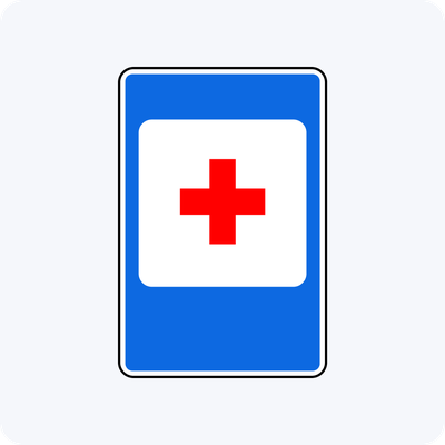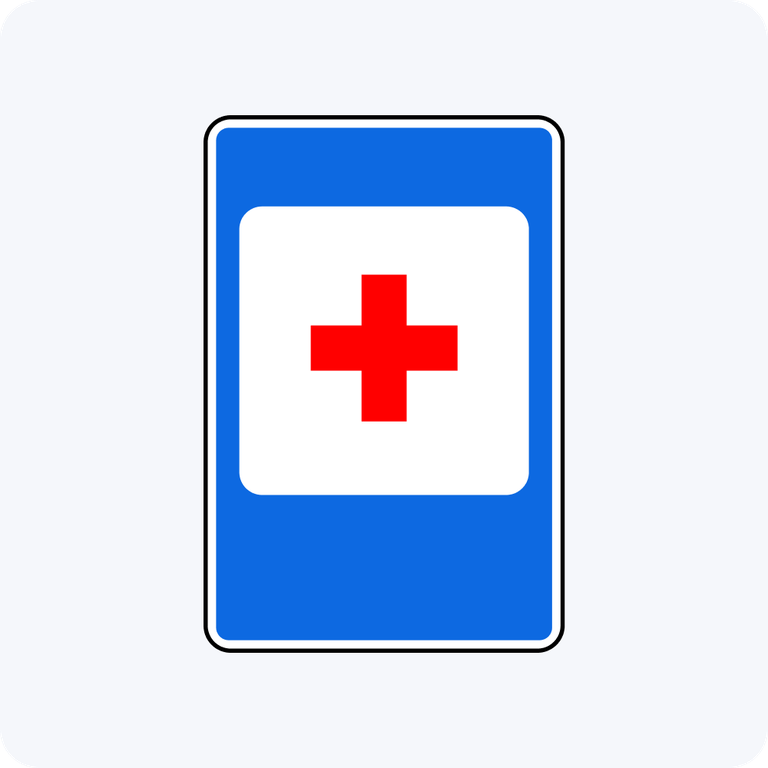 Описание знака: Красный крест на белом прямоугольнике на синем фоне.