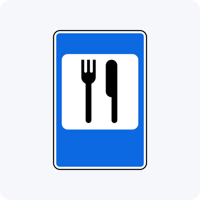 Описание знака: Вилка и нож в белом прямоугольнике на синем фоне.